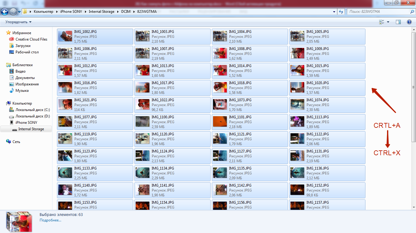 Шаг 7. Вырежьте фото из папок – используйте комбинации CTRL+A («Выделить все») и CTRL+X («Вырезать»).