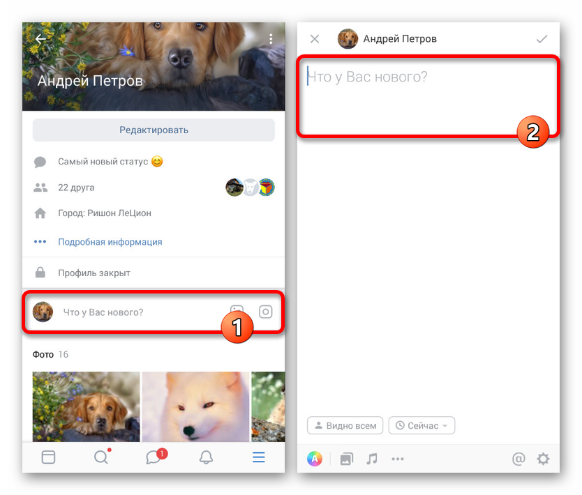 - Откройте официальное приложение ВКонтакте или перейдите на сайт мобильной версии через браузер. Здесь необходимо открыть любое текстовое поле, например, как при создании новой записи.