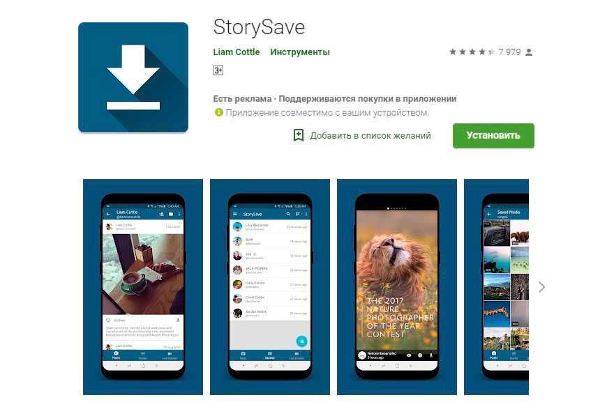 Как выглядит StorySave в Plae маркете (приложение для сохранения сториз на адроид)