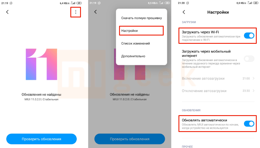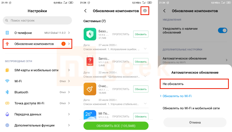 Отключаем обновление компонентов системы Miui. Открываем «Обновление компонентов», нажимаем шестеренку справа сверху, затем «Автоматическое обновление» — «Не обновлять».
