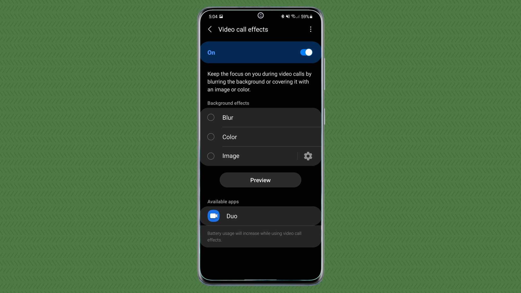 Предполагая, что у вас включен переключатель, вы можете выбрать один из трех вариантов: размытие, цвет или изображение. Меню покажет вам, какие приложения будут поддерживать эффекты видеозвонка.