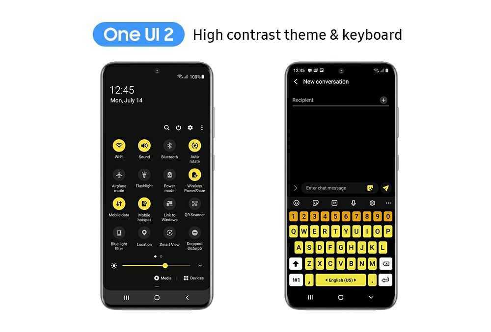 Чтобы всем было удобно пользоваться независимо от возраста или физических особенностей человека, дизайнеры One UI 2 разработали ряд инклюзивных функций, как, например, высококонтрастные темы, комфортные для слабовидящих людей. Для этого специалисты Samsung консультировалась с пользователями, получая отзывы о One UI и реализуя новые идеи улучшения интерфейса.