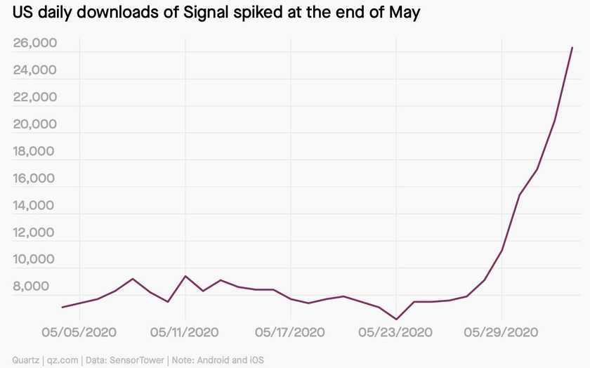 В мае 2020 г на фоне протестов в США вырос спрос на защищенный мессенджер Signal. С 25 мая его скачали 121 000 раз, а в воскресенье 31 мая — рекордные 37 000. В рейтинге приложений App Store мессенджер за это время поднялся с 936 на 126 место по популярности.
