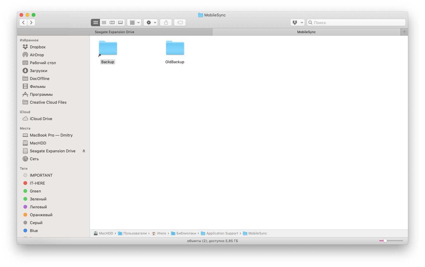 Обратите внимание на обратный слэш «\» перед HD. Я так просто заэкранировал знак пробела в пути./Volumes/SSD/Users/dmitry/Library/Application\ Support/MobileSync