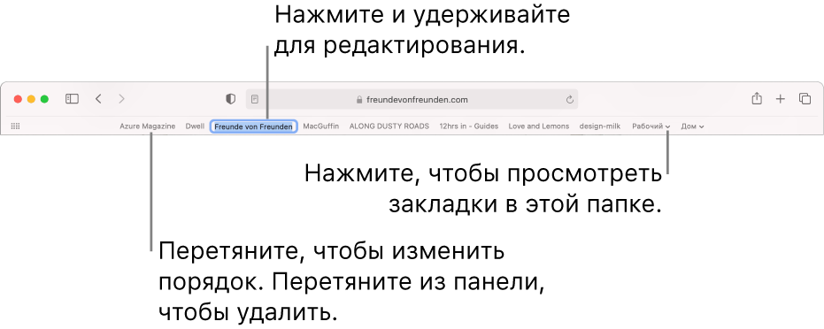 Изменение названия избранного веб-сайта или папки. Удерживая клавишу Control, нажмите название, которое нужно изменить, в строке «Избранное» или на странице «Избранное», затем выберите «Переименовать» в контекстном меню. Также можно нажать с усилием название или нажать на него и держать, пока оно не будет выделено, а затем ввести новое.