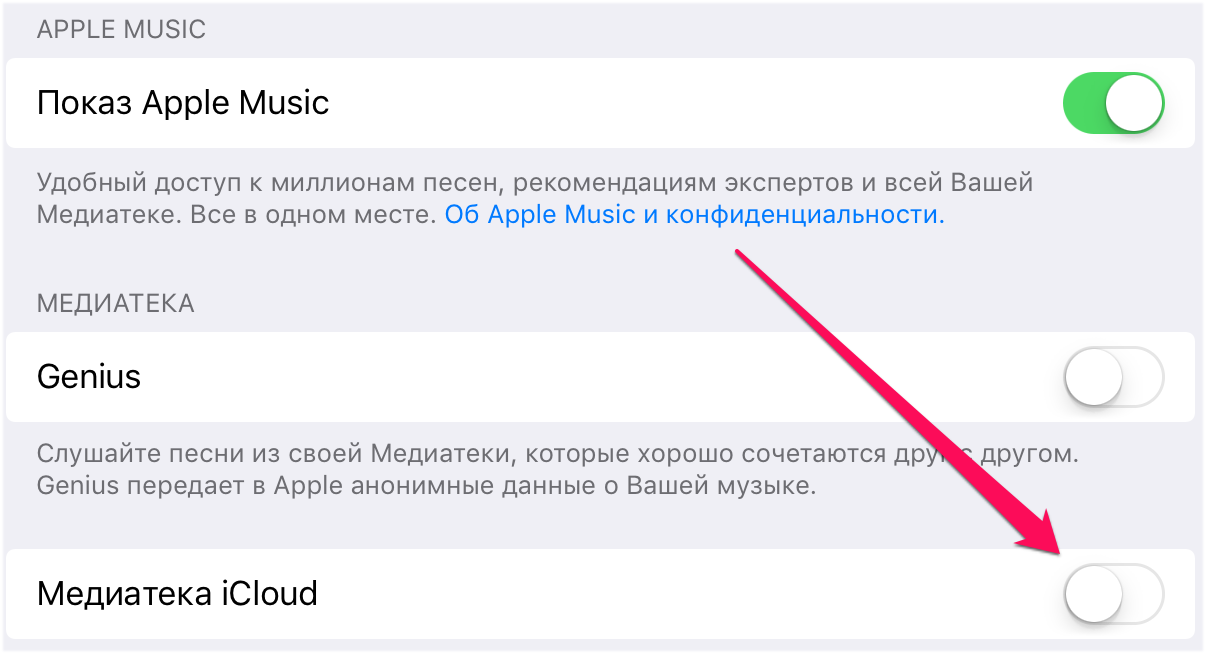 Шаг 1. На мобильном устройстве перейдите в меню «Настройки» → «Музыка» и переведите переключатель «Медиатека iCloud» в неактивное положение.