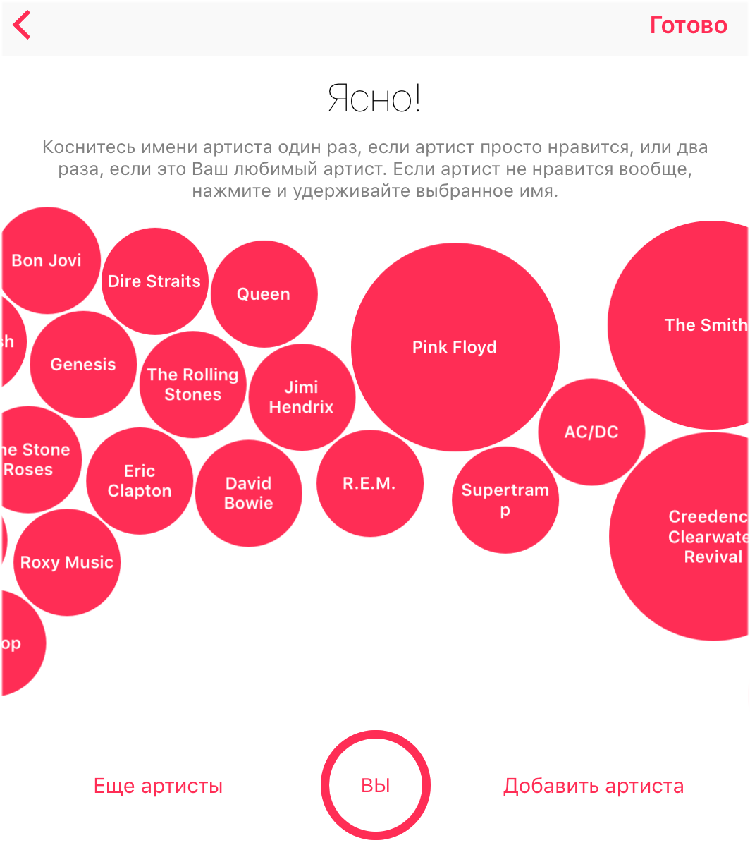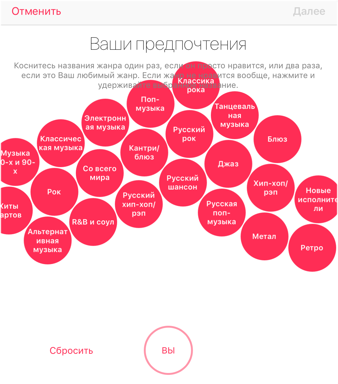 Примечание: нажмите на жанр один раз, если он просто нравится или два раза, если это ваш любимый жанр. Если в списке жанров присутствует нелюбимый жанр, то его можно удалить удержанием.
