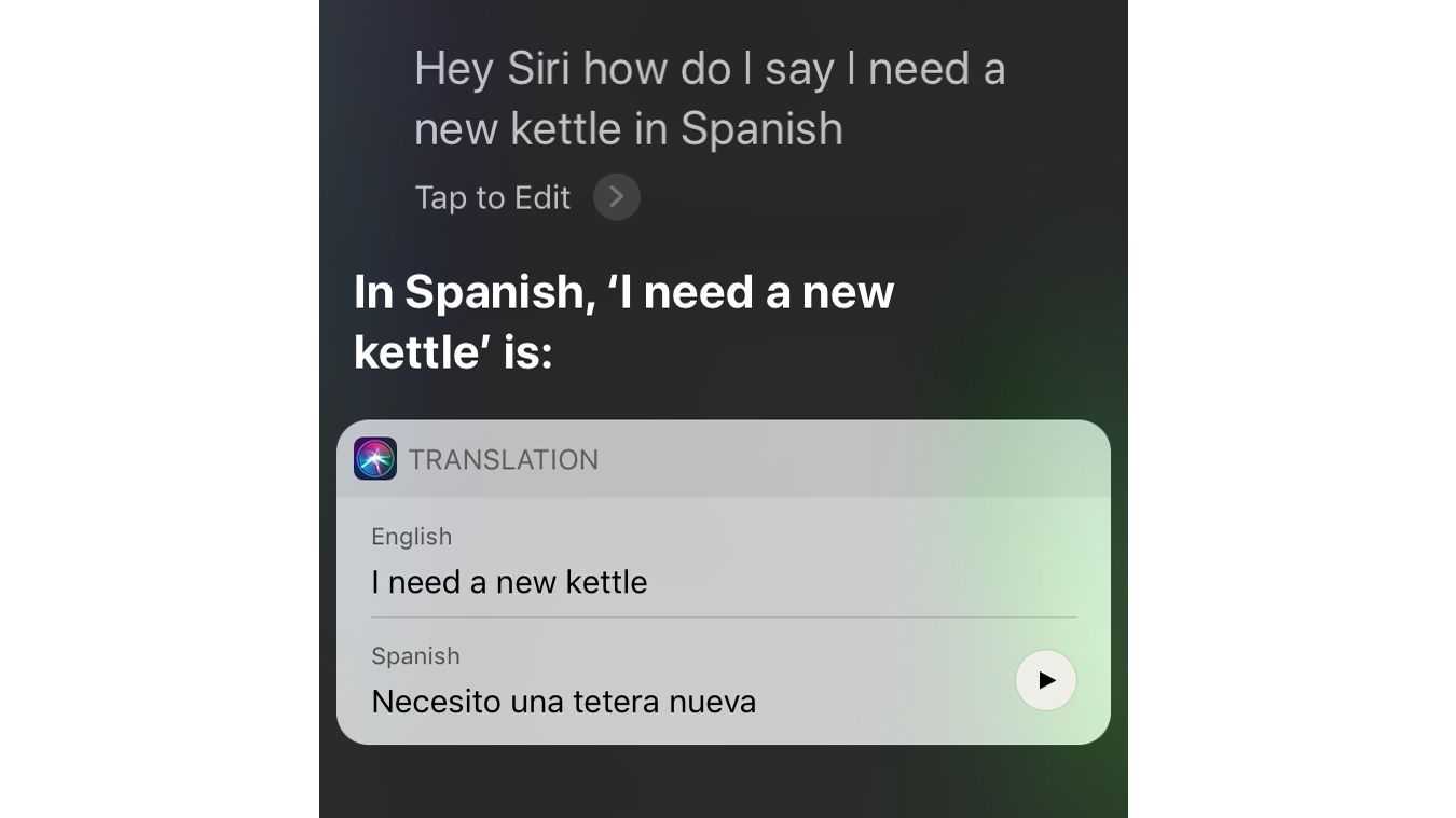 Сири покажет перевод и зачитает его вам. Если вы хотите, чтобы он повторил фразу, вы можете нажать кнопку воспроизведения справа от перевода.