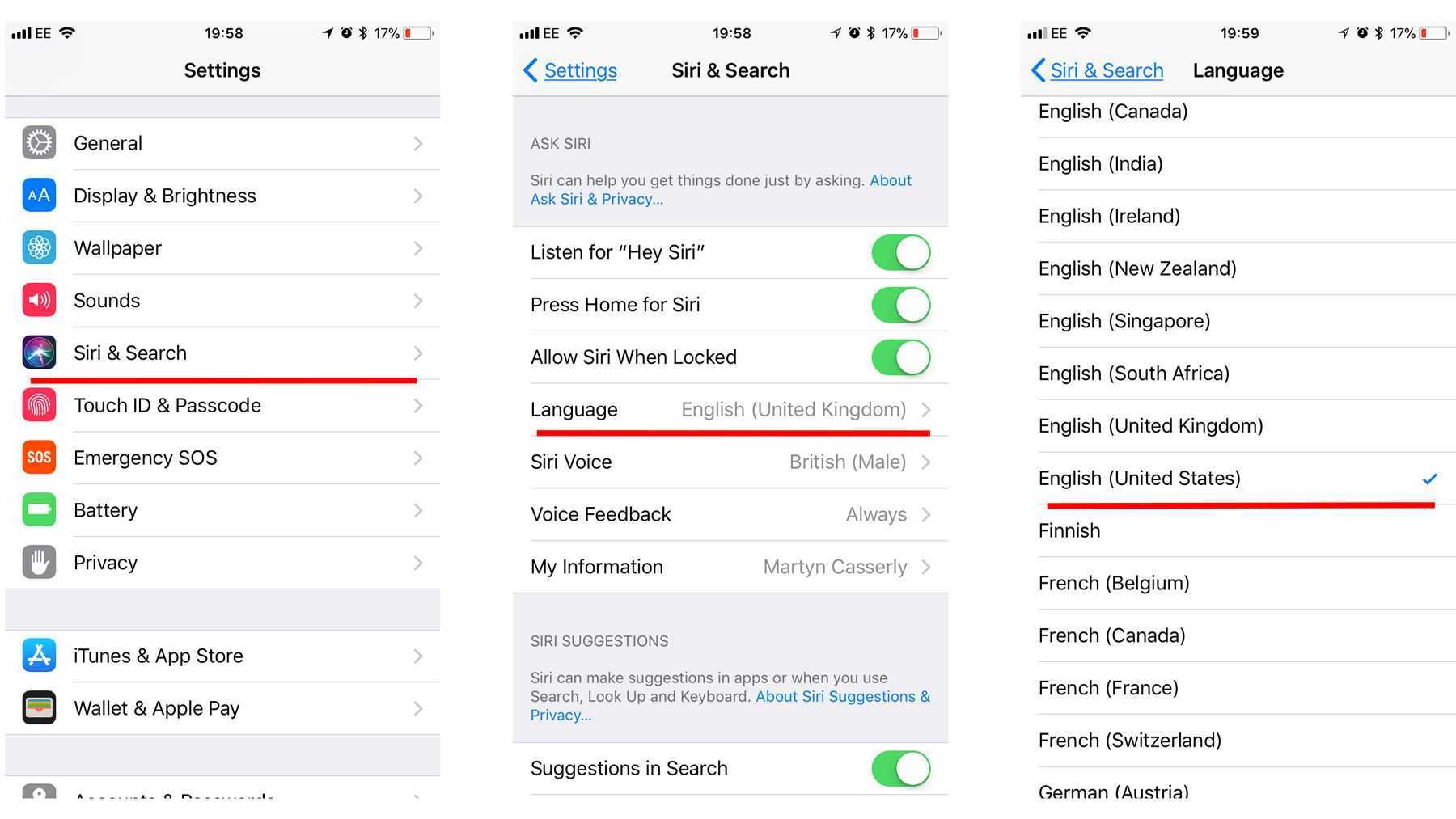 Для этого зайдите в Настройки> Siri Поиск> Язык, затем прокручивайте список, пока не найдете вариант Английский (США), а затем нажмите на него.