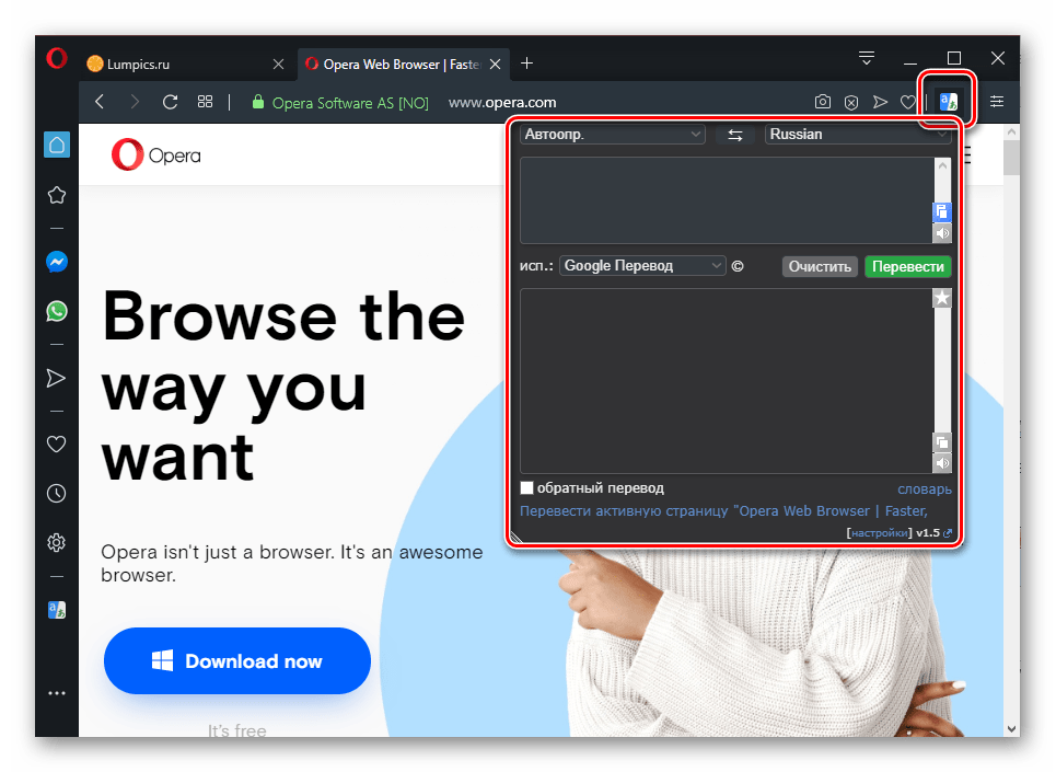 Опера, как и Мазила, к сожалению, не оснащена собственным средством перевода веб-страниц, однако этот недостаток также легко устраняется путем установки соответствующего дополнения из фирменного магазина. Отличным решением является Translator, который, помимо поддержки множества языков, может похвастаться еще и интеграцией с популярными сервисами онлайн-перевода, в числе которых Google, Promt, Bing и другие. Работать это расширение может в одном из двух режимов – ручном и автоматическом. В первом перевод текста на русский потребуется инициировать самостоятельно, во втором это будет делаться без вмешательства пользователя, если предварительно задать необходимые настройки. Говоря о последних, нельзя не отметить их гибкость. Инструкция по установке Translator и тому, как его использовать в браузере, ранее была составлена одним из наших авторов.
