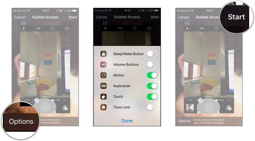 Шаг 5. Появится начальный экран Guided Access, который позволяет вам нарисовать круг вокруг областей экрана, которые нужно отключить (установите его либо на весь экран, либо ни на один из них). В качестве альтернативы выберите «Параметры» в правом нижнем углу экрана, который можно использовать для отключения всего: от кнопок регулировки громкости до сенсорного экрана, а также установите ограничение времени для сеанса управляемого доступа (до 24 часов).