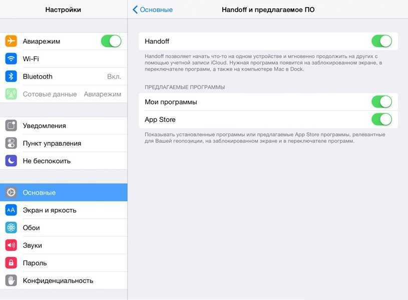 Таким же востребованным способом является отключение в меню настроек «Основные» функции непрерывности «Handoff«, которая обеспечивает совместную работу устройств с разных мест. Функция «Handoff» – это плотная взаимосвязь с iOS-устройствами. Если iPhone или iPad с iOS 8 расположены возле Mac, то данная функция помогает начинать любое действие на айфоне, а заканчивать уже на айпаде.