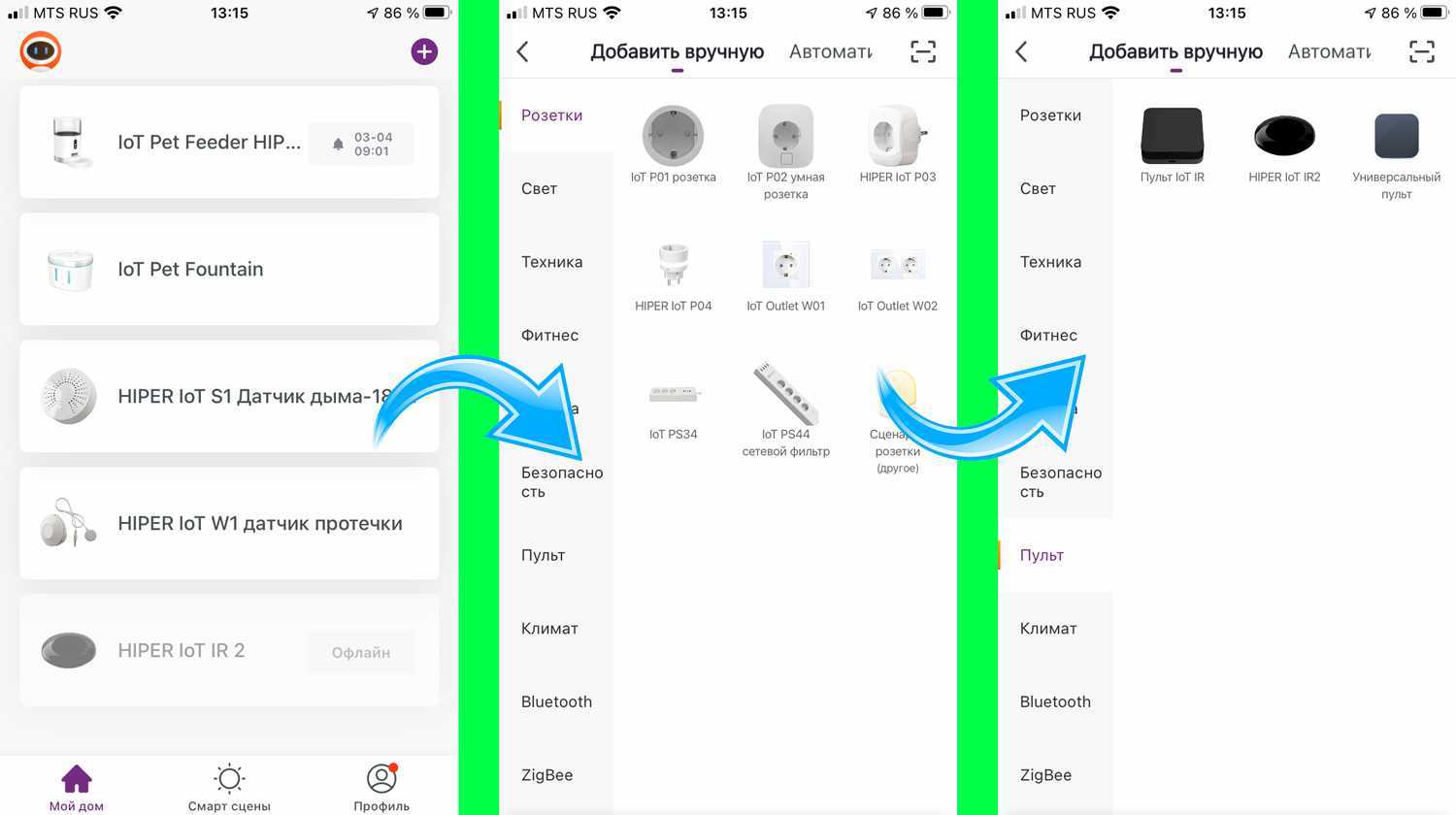 Рассматриваю добавление устройства вручную. Перечень категорий девайсов располагается справа.