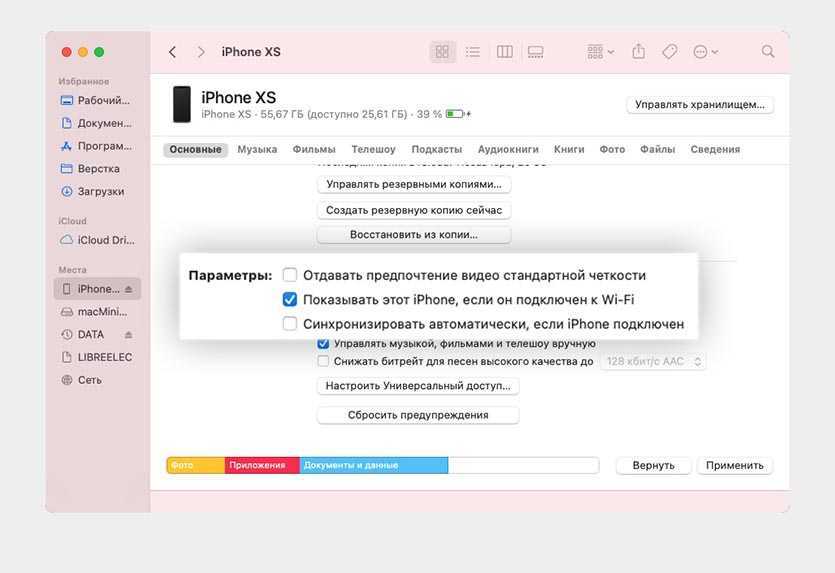 5. В iTunes или Finder (в macOS Catalina и новее) разрешите подключение к iPhone по Wi-Fi, это пригодится в дальнейшем.