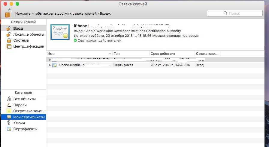 Запустите Keychain Access. Выберите Вход в верхней-левой панелиВыберите “My Certificates” из меню “Category”Найдите Ваш сертификат iPhone Distribution Certificate с названием, которое Вы задали: iPhone Distribution: My Company. Не выбирайте iPhone Developer: My Company — он не будет работать!Разверните строку, внутри увидите Ваш Private Key. С названием Имя Фамилия.