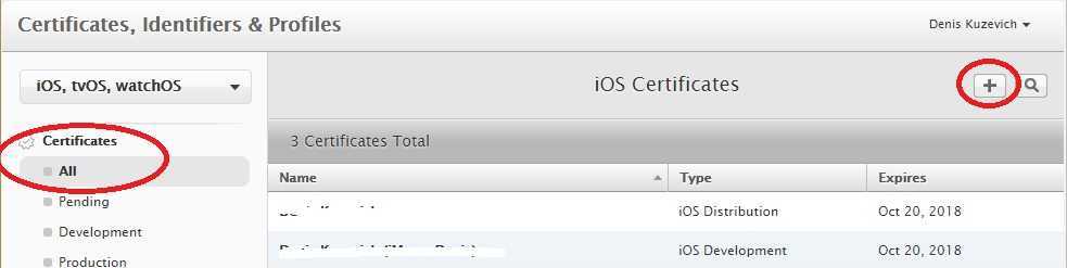 Затем заходим на https://developer.apple.comВыбираем пункт меню «Certificates, IDs & Profiles»