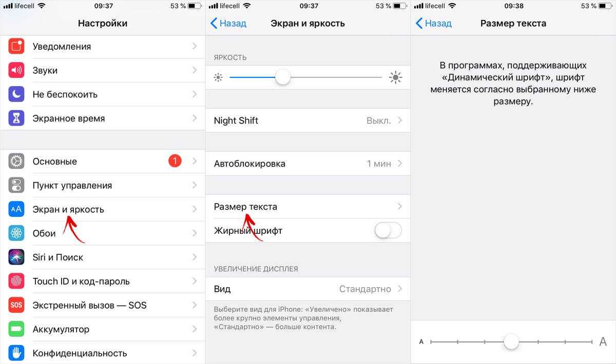 На главном экране перейдите в раздел «Настройки». Откройте пункт меню «Экран и Яркость». В появившемся окне Вы можете изменить размер текста iPhone с использованием настроек, которые показаны у нас на скриншоте.