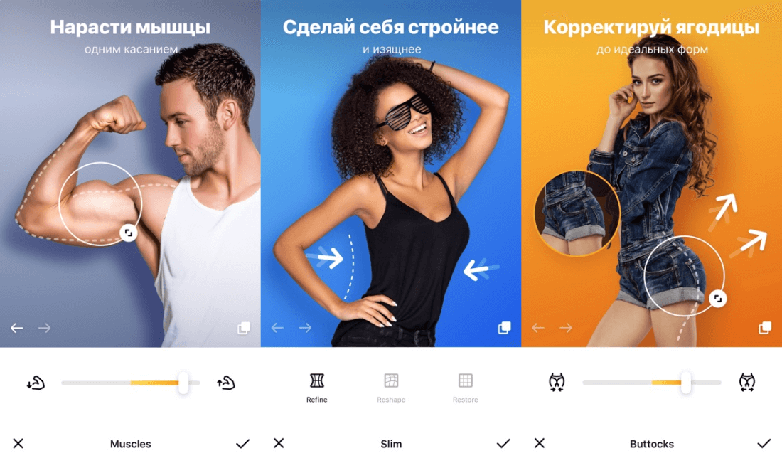 Приложение также позволяет улучшить тон кожи, добавить загара или нанести татуировки. Вы можете контролировать интенсивность каждого параметра и выбирать форму, например, пресса, ориентируясь на собственные представления о красоте.