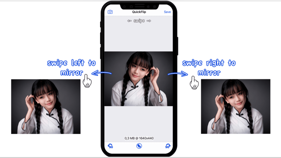 QuickFlip имеет достаточно простой интерфейс и небольшой набор команд. Приложение создано для изменения размера изображения и его отражения. Так, в программе можно легко отзеркалить фото при помощи движений пальцев.