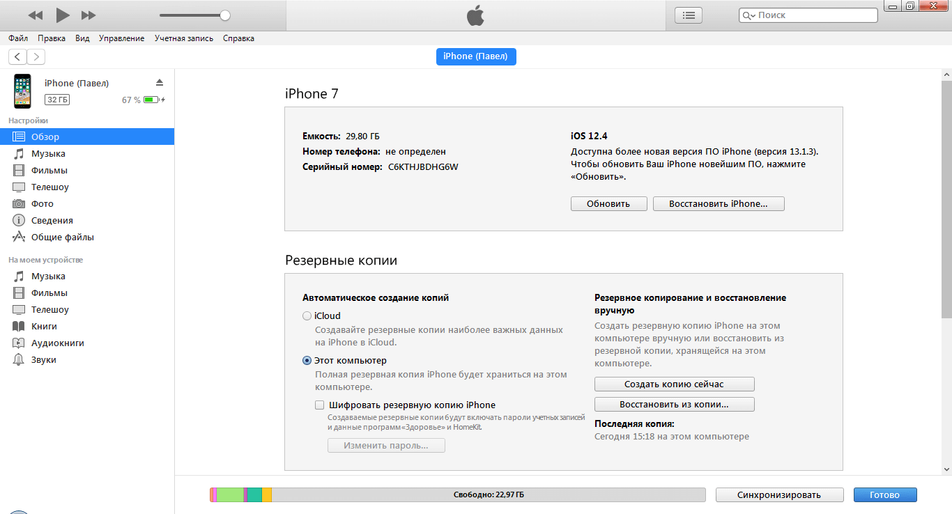 В окне iTunes щелкни мышью на значке телефона в верхней части левой панели и в окне «Обзор» установите переключатель «Автоматическое создание копий» в положение «Этот компьютер», после чего нажмите на кнопку «Создать копию сейчас».