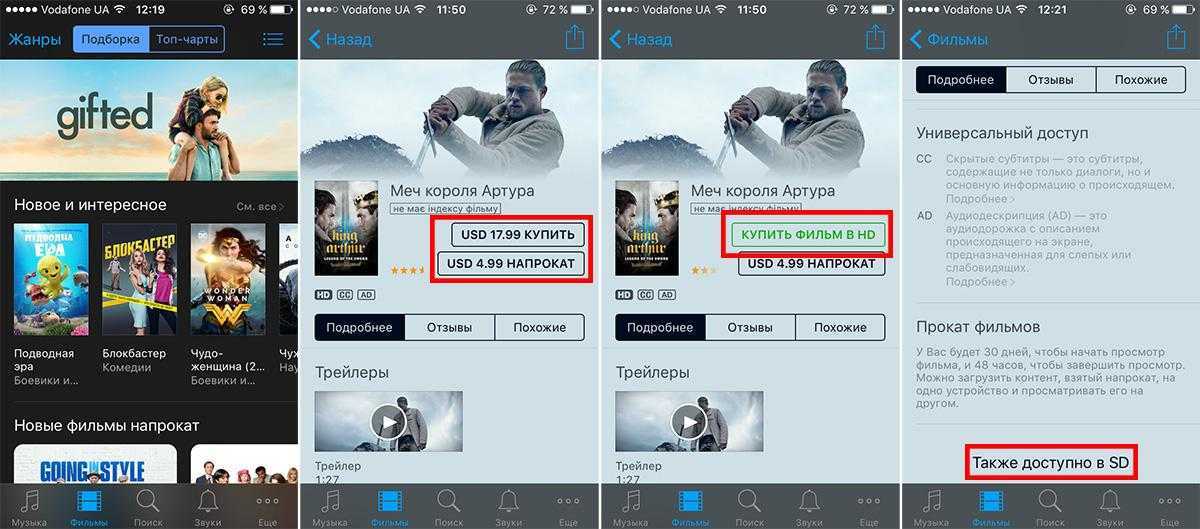 Для осуществления операции понадобится открыть соответствующие приложения, выбрать фильм и нажать кнопку «Купить» или «Напрокат».