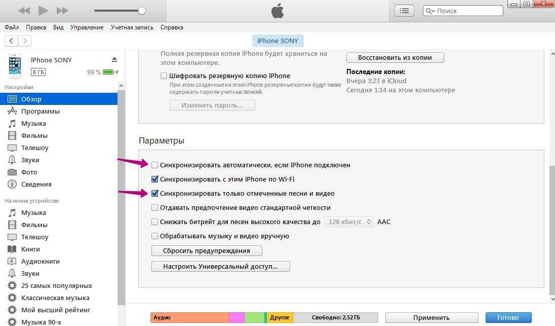 Шаг 3. На вкладке «Обзор» прокрутите вниз и установите флажок «Синхронизировать только отмеченные песни и видео». Такая «метка» позволит вам не потерять только что загруженные на iPhone данные при общей синхронизации.