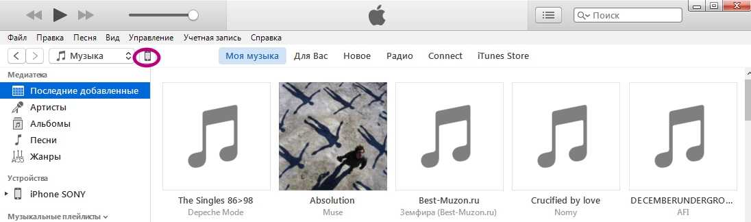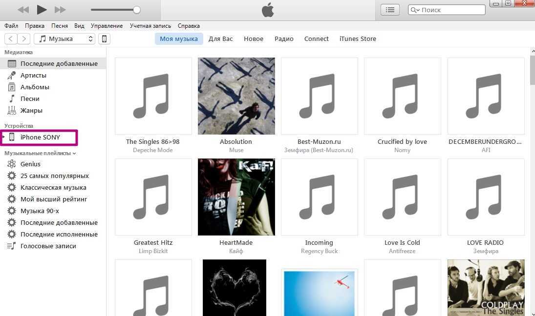 В левой колонке в разделе «Устройства» вы найдете свой гаджет (в нашем случае iPhone SONY, выделен красным).