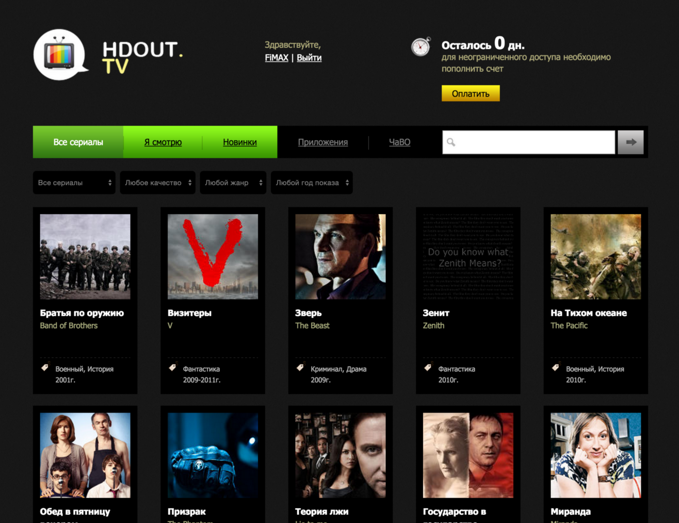 Неплохой неофициальный ресурс, но не имеющий множества достоинств. Регистрация осуществляется по коду, который узнать не проблема. Например, от релиз-группы “Кубик в кубе” — kubik3, я регистрировался по нему, но не уверен, работает ли сейчас. После регистрации даётся 3 дня демо-режима, в рамках которого для просмотра доступно около 10 сериалов (совсем неактуальных и непопулярных). Особенностью является наличие нескольких русских озвучек от разных релиз-групп для популярных шоу. Добавляются новые серии медленно, а с субтитрами и оригинальными дорожками вообще беда, их почти нет, вообще никаких. Существуют плагины для Plex и XBMC. Из мобильных приложений — только для Android, отсутствующее в Google Play и устанавливаемое apk-файлом. Стоимость подписки в евро, 2,95 — месяц, 8,85 — квартал, 17,7 — полгода, 35,4 — год.