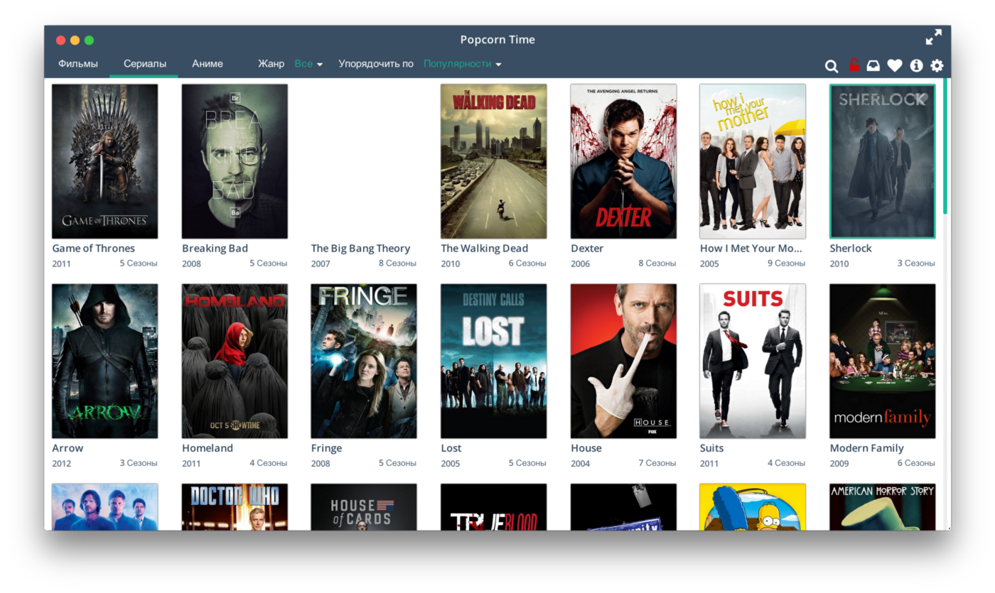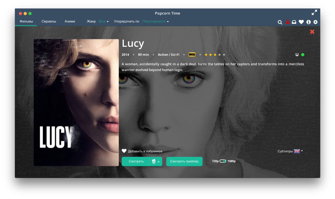 И последний ресурс в этом большущем обзоре, новенький, но перспективный. Находится на стадии бета-тестирования и совмещает в себе как фильмы, так и сериалы. Помните, в начале топика я упоминал торренты? Так вот, современный Интернет позволяет воспроизводить онлайн и торрент-содержимое. ПО для такой возможности существует разное, но с помощью него вы всё равно должны находить торрент-ссылку перед просмотром, что неудобно и занимает время. Popcorn Time делает всё это за вас, это бесплатный комбайн, который позволяет смотреть фильмы и сериалы по p2p-сети. Соответственно, это всё работает как торрент-трекеры. Во время просмотра вы не только принимаете, но и раздаёте. Нет раздающих — “кина не будет”. Перед просмотром требуется небольшая предзагрузка данных, в мобильном приложении почему-то занимающая больше времени (около минуты). Есть приложения для настольных ОС, Android, с iOS пока проблемы, приложение было, но перестало работать после обновления до iOS 8.3. Аппы качаются только с сайта, в маркетах их, разумеется, нет, так как всё нелегально. Что касается озвучки, то так как проект международный, то в данном случае доступна только английская оригинальная дорожка, что лично меня, всецело устраивает. Зато субтитры — на любой вкус. Фильмы доступны как в 720p, так в 1080p (!), а сериалы — только в 720p и 480p. И с фильмами ситуация обстоит намного лучше, чем с сериалами. Качество ведь лучше, да и у некоторых сериалов есть не все эпизоды, некоторые временами не доступны для просмотра. Так как это бета-проект, сервис пока достаточно нестабильный. Почему-то сегодня у меня не работают субтитры на декстопном приложении, хотя вчера всё было ок, не помогла даже переустановка. Может какие работы ведутся. Мобильное приложение бывает виснет. Обложки пропадают, кстати, на скриншоте выше такое видно. В общем, косяков полно, но в то же время проект действительно интересный и перспективный.