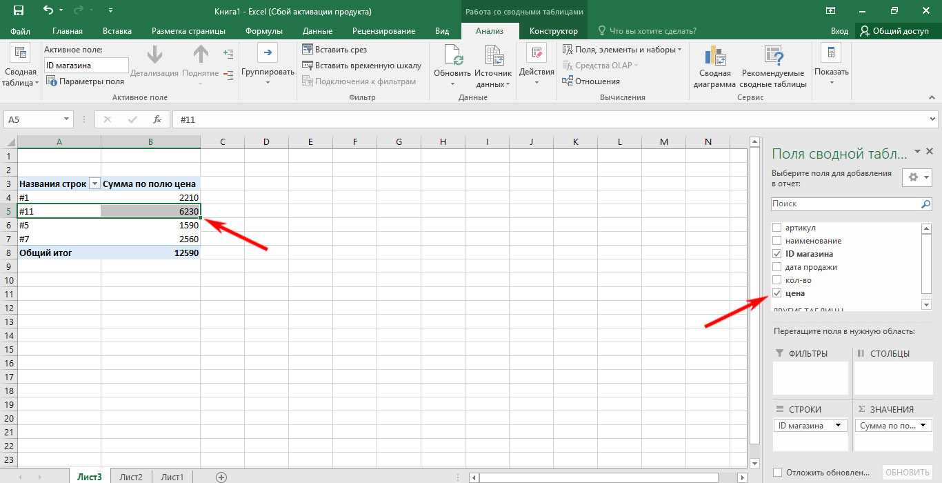 Выберите поля для отображения в итоговом отчёте: ID магазина, цена. Данные в сводной таблице просуммируются по каждому ID в отдельности. Теперь очень легко найти нужное число.