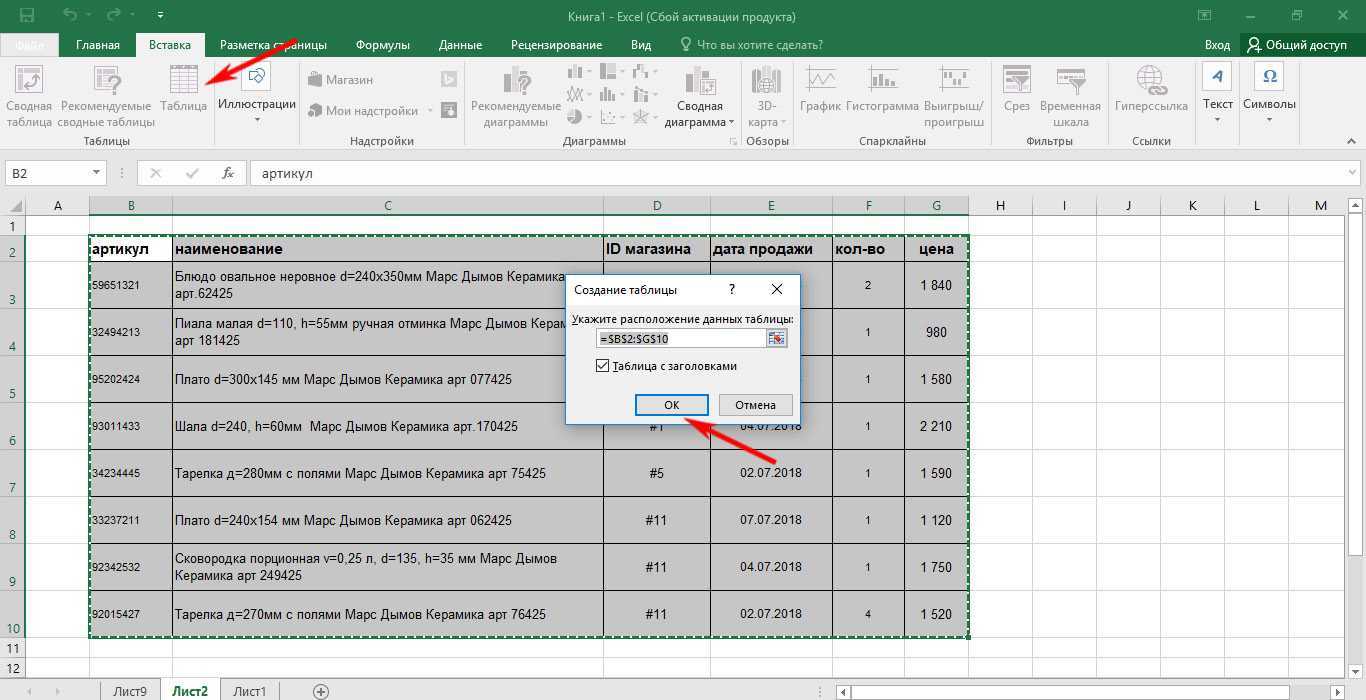 Примените к диапазону команду Таблица: Верхнее меню → Вставка → Таблица. Появится всплывающее окно, в котором система автоматически проставит ваш выделенный диапазон. Нажмите ОК.