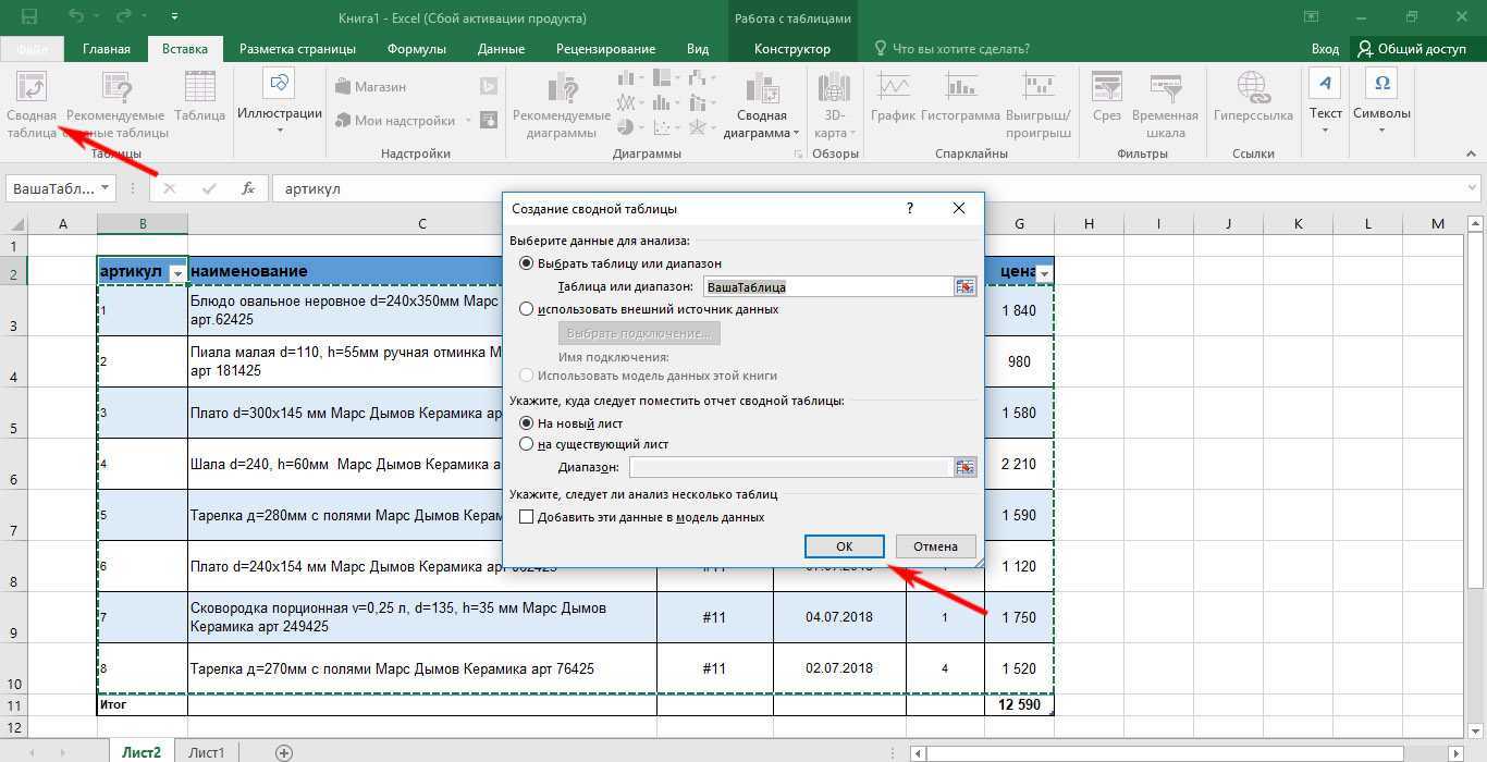 Примените команду: Верхнее меню → Вставка → Сводная таблица. В открывшемся окне задайте параметры новой сводной таблицы и нажмите ОК. Лучше всего будет разместить её на новом листе.