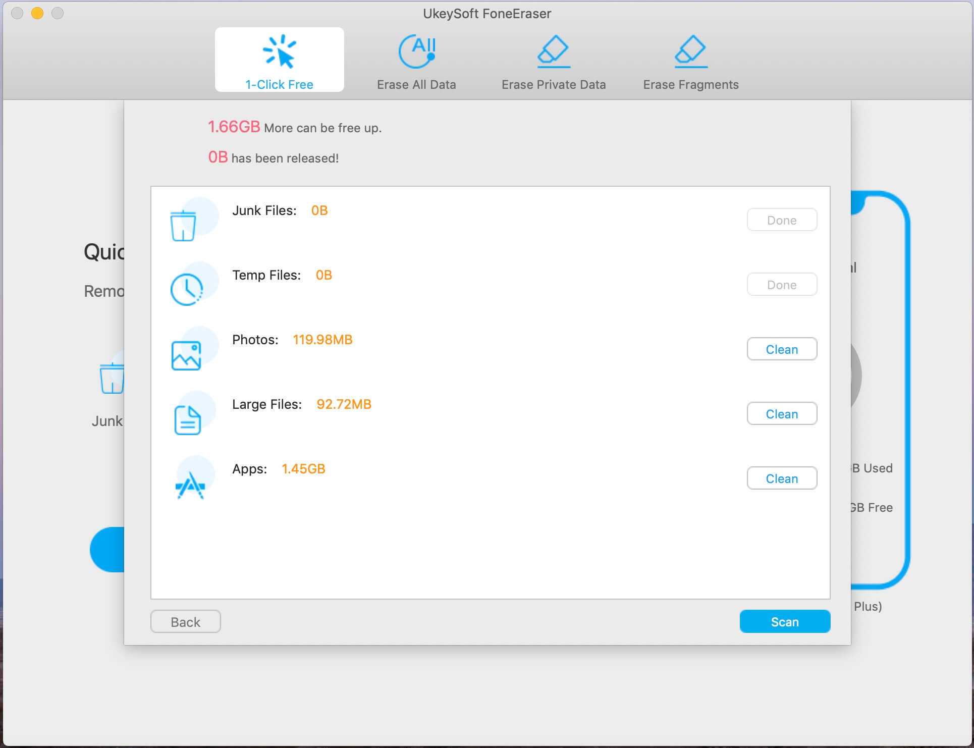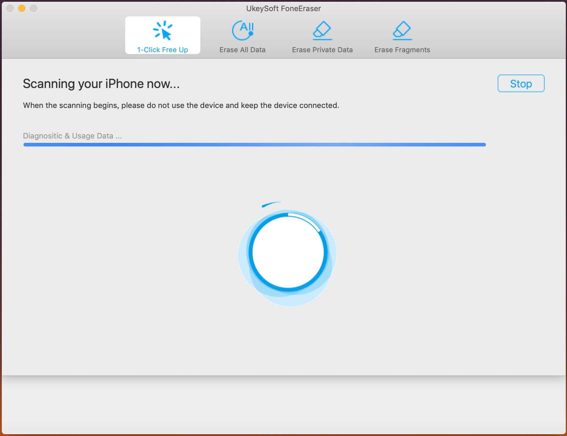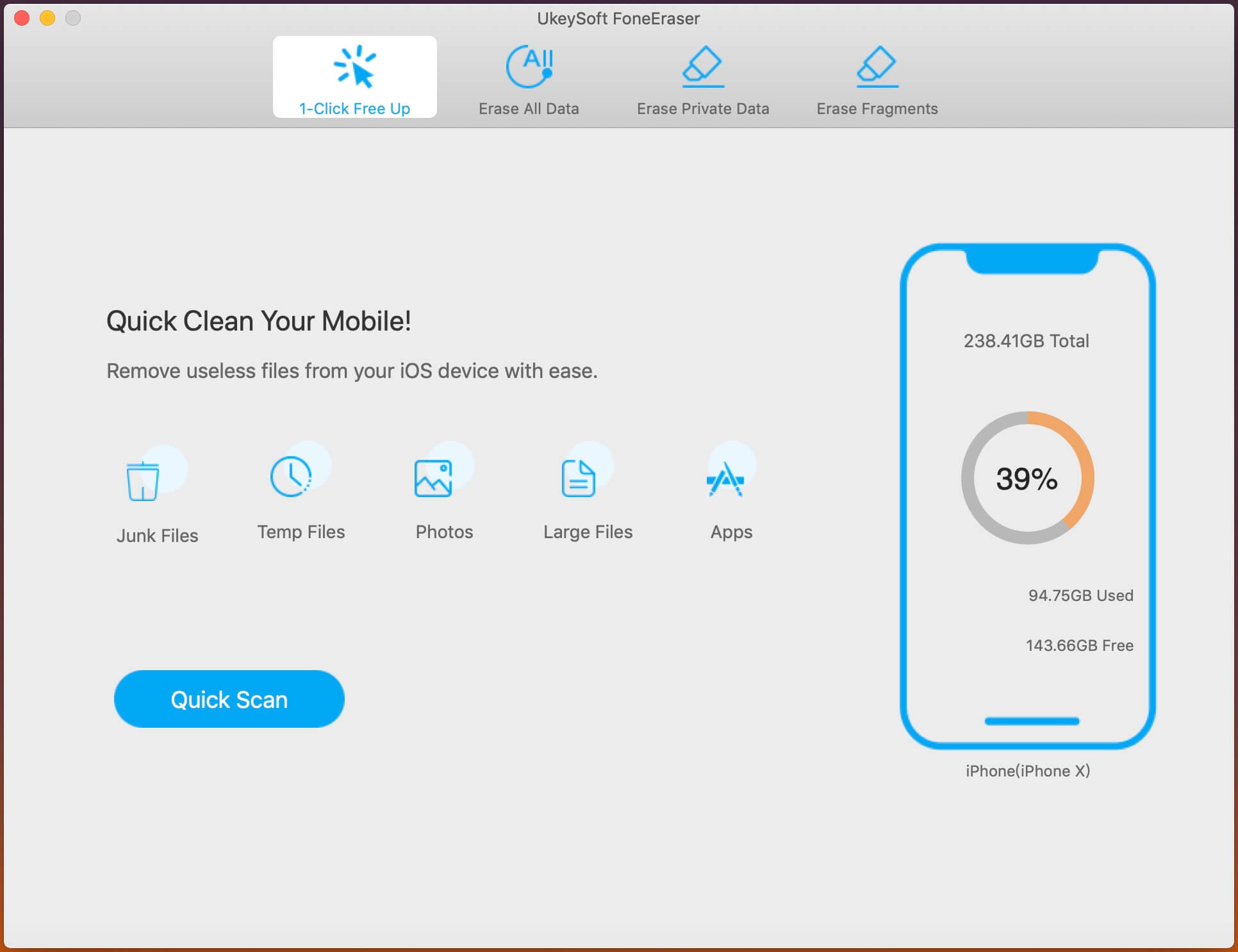 Установите и запустите UkeySoft iOSEraser на своем компьютере и подключите iPad к компьютеру с помощью подходящего USB-кабеля. Чтобы очистить кэш на iPad и ускорить работу iPad, нажмите «1-Click Free Up Space», и программа автоматически проанализирует объем памяти вашего iPad.