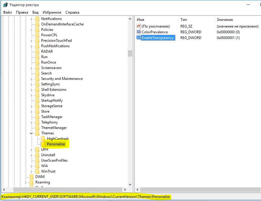 Примечание: При установке значения данных EnableTransparency до 0, выключится опция Сделать Пуск, Панель задач и Центр уведомлений прозрачными. Тем не менее, если вы вручную отключите эту опцию, то фон не станет прозрачным.