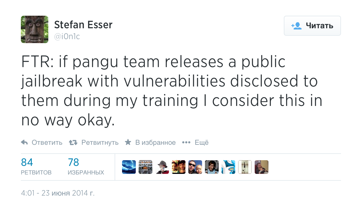 Уязвимость, которая лежит в основе джейлбрейка iOS 7.1-7.1.x при помощи Pangu была найдена благодаря обучению проводимому известным среди джейлбрейкеров хакером @i0n1c. Об этом упоминается в окне программы: «Thanks for infoleak bug from @i0n1c training».
