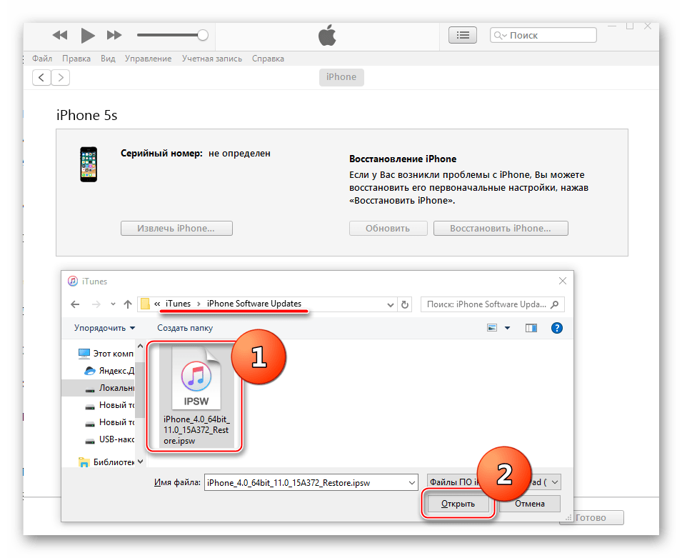 Открывается окно Проводника, в котором необходимо указать путь к прошивке. Отметив файл *.ipsw, нажимаем кнопку «Открыть».