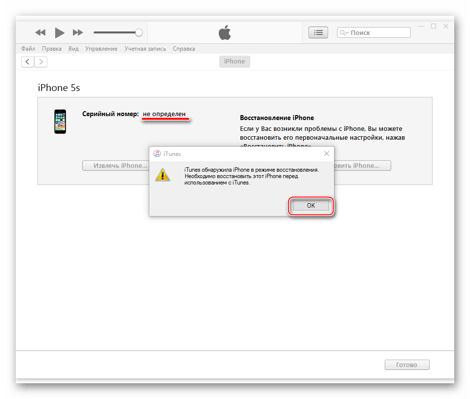 Дожидаемся момента, когда iTunes определит аппарат. Здесь возможно два варианта: