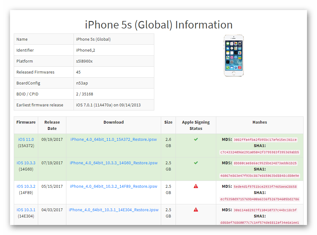 Прежде чем переходить к установке прошивок в iPhone 5S, необходимо получить пакет, содержащий компоненты для инсталляции. Прошивки для установки в iPhone 5S – это файлы *.ipsw. Следует учитывать, что инсталлировать удастся только последнюю версию системы, выпущенную Apple для использования в качестве операционной системы девайса. Исключением являются версии прошивок, предшествующие новейшей, но устанавливать их получится лишь в течении нескольких недель после официального релиза последней. Получить нужный пакет можно двумя путями.