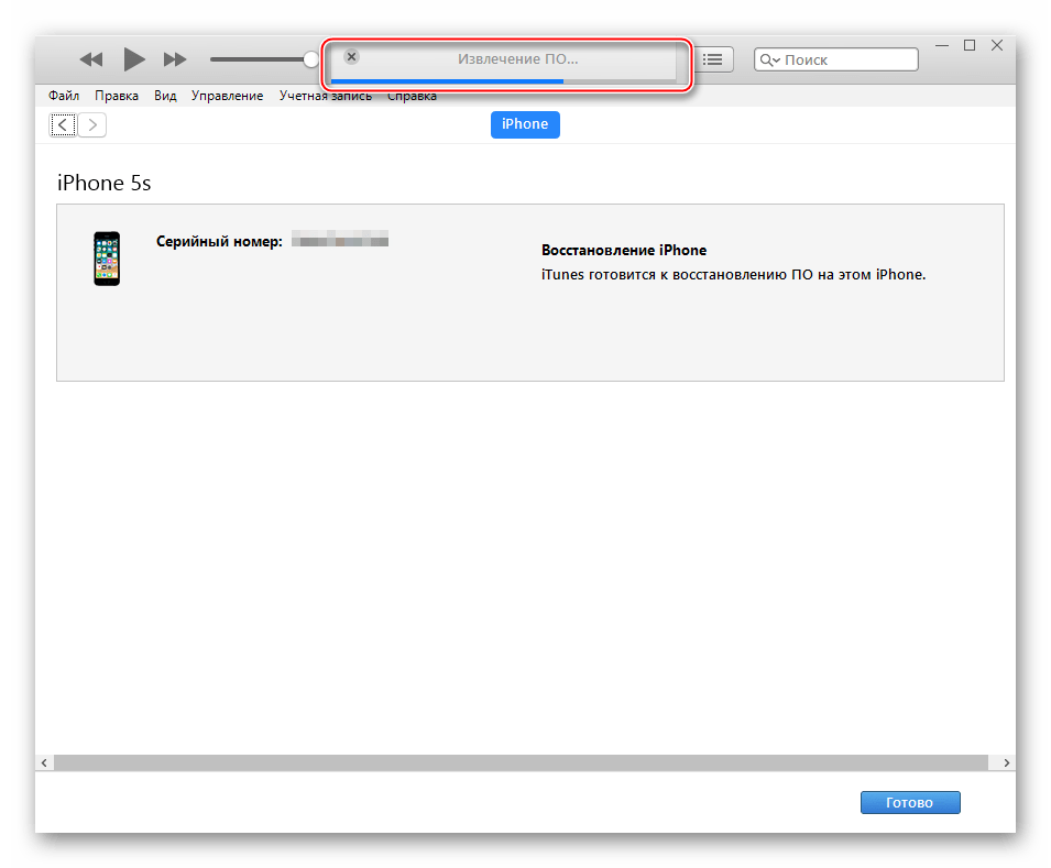 Дальнейший процесс прошивки iPhone 5S производится iTunes в автоматическом режиме. Пользователю остается лишь наблюдать за уведомлениями о происходящих процессах и индикатором выполнения процедуры.