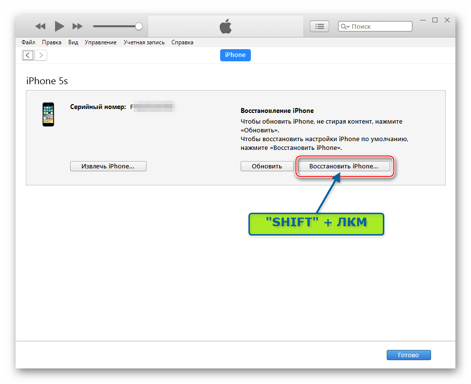Нажимаем клавишу «Shift» на клавиатуре и кликаем по кнопке «Восстановить iPhone…».