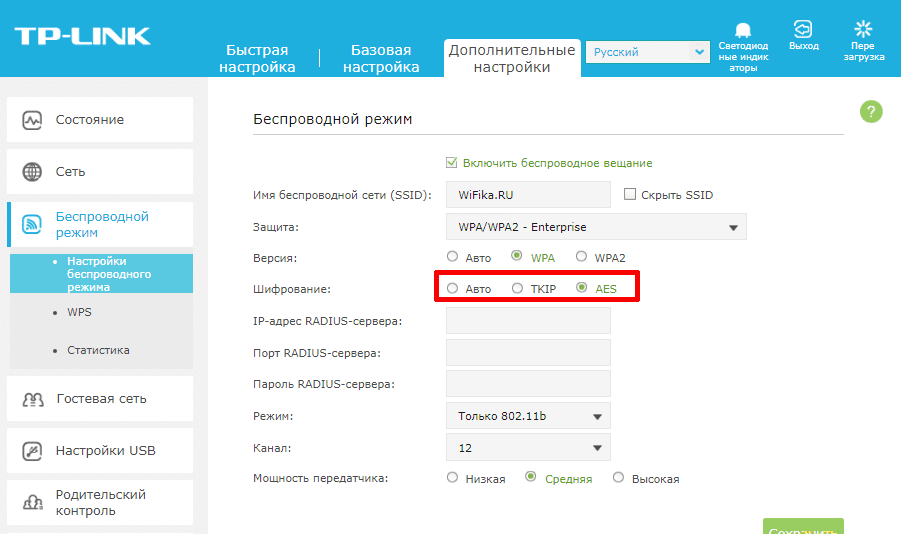 - Для начала попробуйте выполнить самое простое — перезагрузите маршрутизатор, а затем дождитесь его полного запуска. Если это не поможет, проверьте настройки роутера, в частности — метод шифрования (желательно устанавливать WPA2-PSK). Как показывает практика, именно данный пункт настройки часто влияет на отсутствие подключения на iPhone. Изменить метод шифрования можно в том же меню, где осуществляется смена ключа безопасности беспроводной сети.