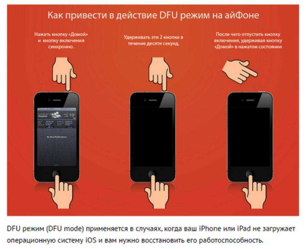 Вывести Айфон 5s или другое устройство Apple из такого состояния поможет прошивка в режиме Recovery mode или DFU. В первом режиме произойдет полный сброс настроек гаджета, он вернется к заводским установкам. Во втором запускается более глубокое обновление, с восстановлением системных компонентов iOS. Оба режима можно запустить, если вы забыли пароль от устройства.