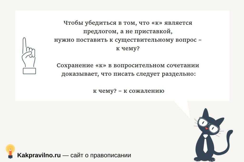 Словосочетание «к сожалению» – фразеологизм (неизменяемое), состоящий из имени существительного «сожаление» в дательном падеже с предлогом «к». Обладает некоторыми свойствами обстоятельственного наречия причины (отвечает на вопрос «как так?», но не на «почему?» и «отчего?». Постановка ударения к сожале́нию. Переносы из строки в строку не рекомендуются; в рукописях при нехватке места в строке допустимо переносить к со-жа-ле́-нию или к сож-ал-е́н-ию. Оставлять предлог в верхней строке нельзя, это считается пунктуационной ошибкой.
