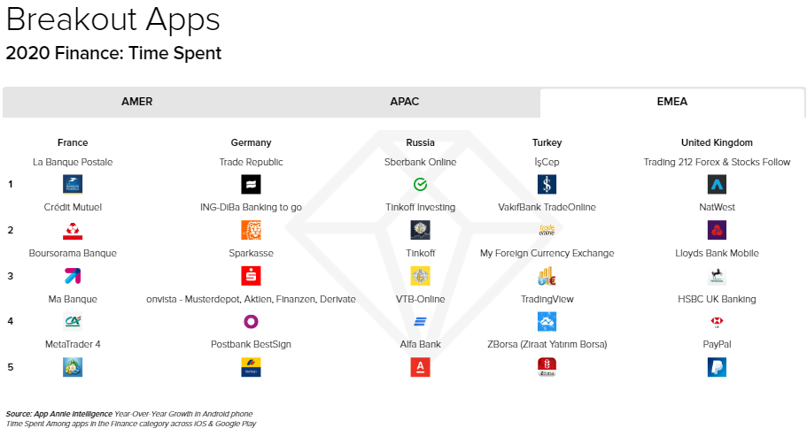 Лидером по проведённому времени стало приложение СберБанк Онлайн, на второе место в нестабильном экономическом году вырвалось приложение Тинькофф Инвестиции, тогда как само приложение банка Тинькофф заняло третье место.