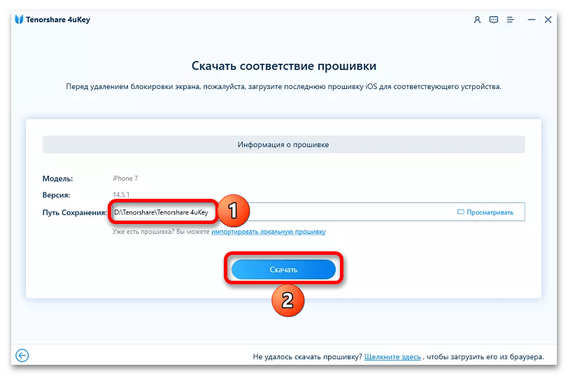 Софт 4uKey предложит вам загрузить последнюю версию прошивки iPhone. Укажите желаемое место для сохранения на компьютере и подтвердите свое желание ее «Скачать».