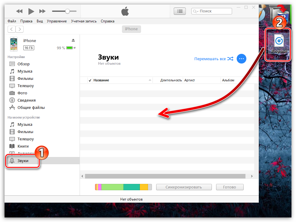 В левой области пройдите ко вкладке «Звуки». Все, что вам остается сделать — это просто перетащить мелодию с компьютера (в нашем случае она на рабочем столе) в данный раздел. iTunes автоматически запустит синхронизацию, после чего рингтон будет сразу перемещен на устройство.