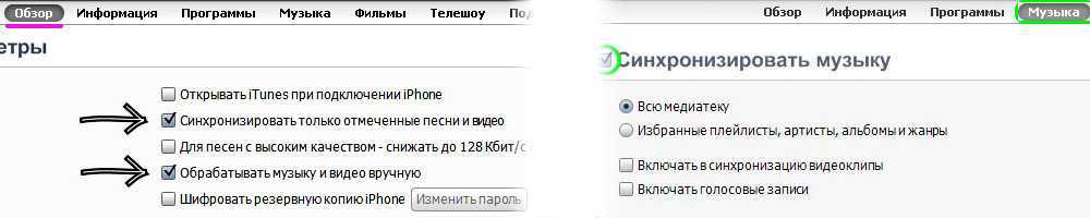 - Там же пометьте галочкой «Синхронизировать только отмеченные песни и видео», во избежание потерь всех своих новых данных при общей синхронизации.