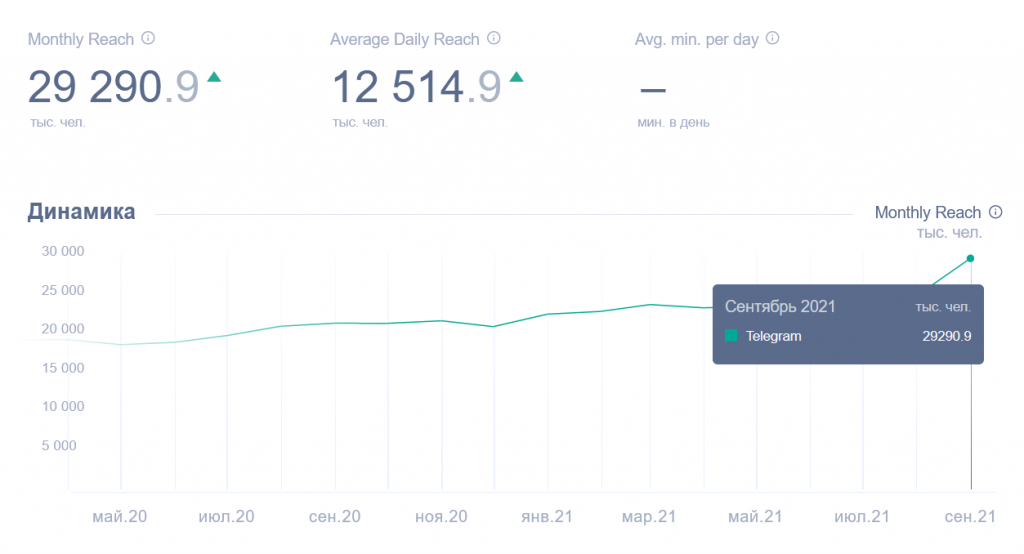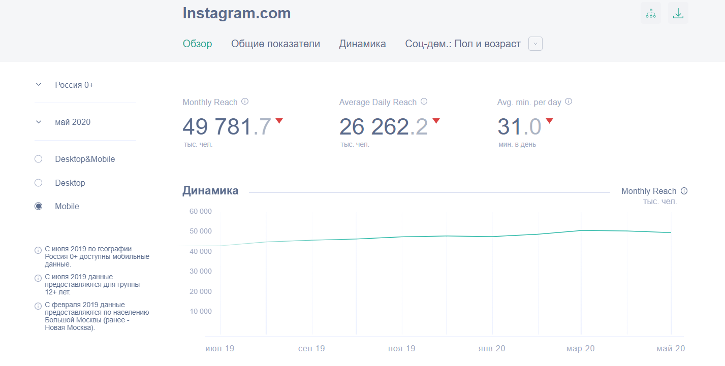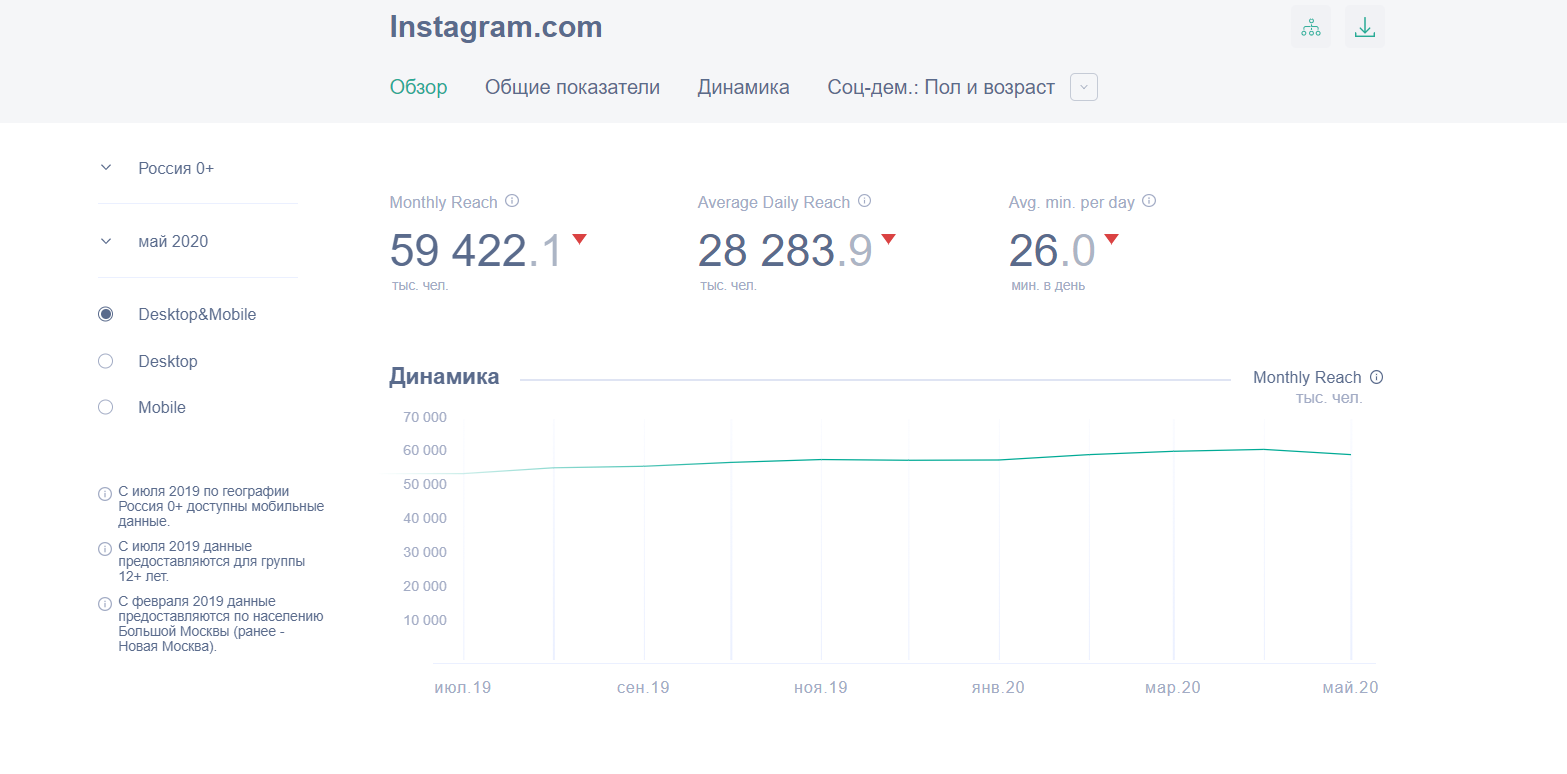 Ежемесячный охват пользователей из России в Instagram в мае 2020 года составил 59,4 млн пользователей. Ежедневно в Instagram заходили 28,3 млн россиян. В среднем пользователи проводят в Instagram 26 минут в день.