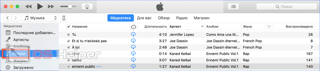 - Нажать на вкладку «Песни», в блоке «Медиатека» (он находится с левой стороны окошка программы «Айтюнс»).