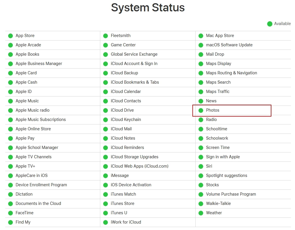 Порой при загрузке фотографий на iPhone или iPad возникают проблемы на стороне сервера iCloud, и вы получаете данную ошибку. В этом случае вам следует немного подождать, а так же посетить страницу состояния системы Apple, выполнив следующие действия: